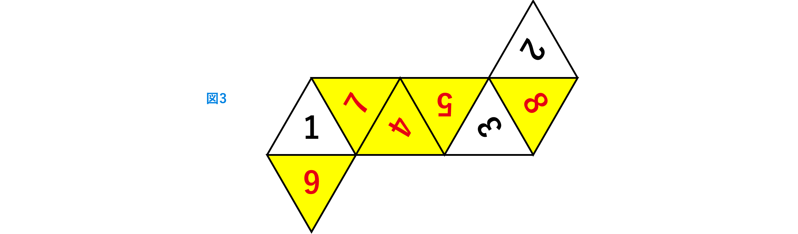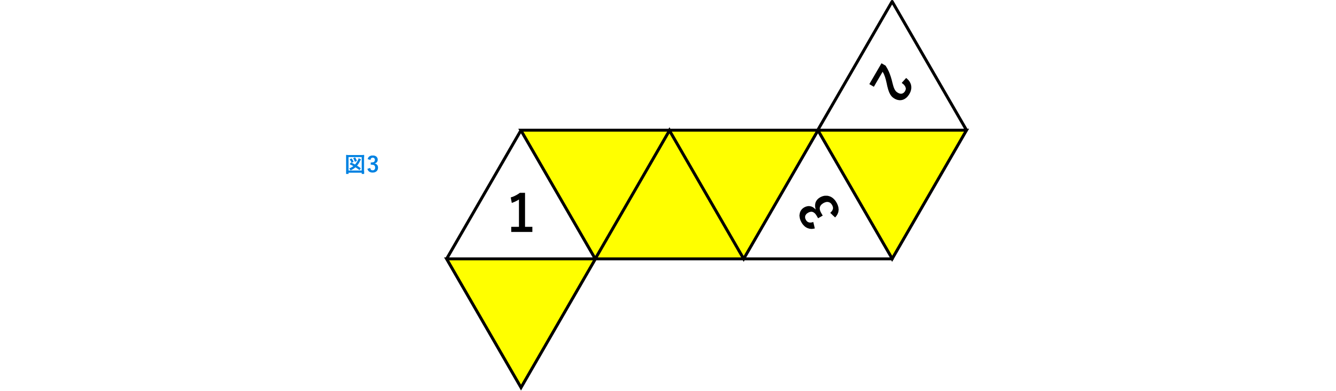 (4)この立体の展開図で、1,2,3の書かれている三角形の配置が図3のようになるとき、