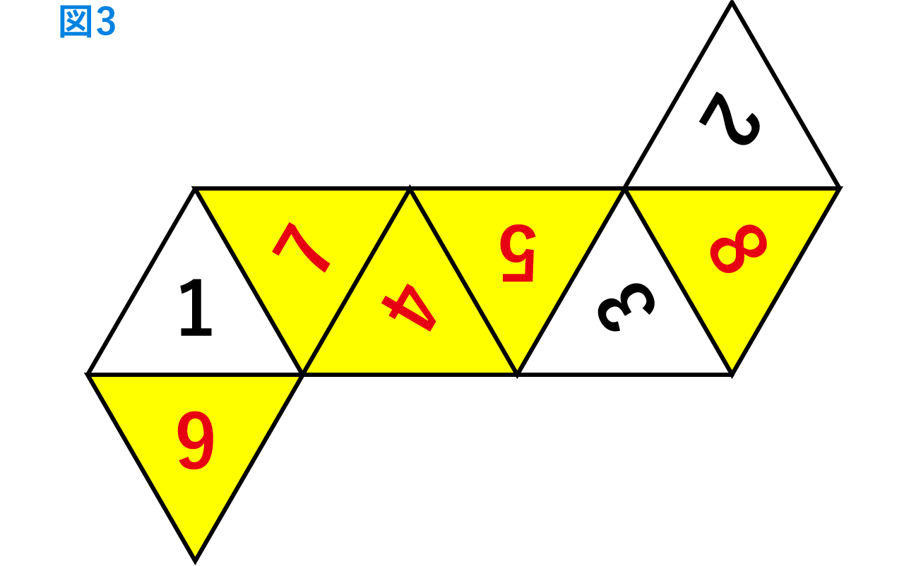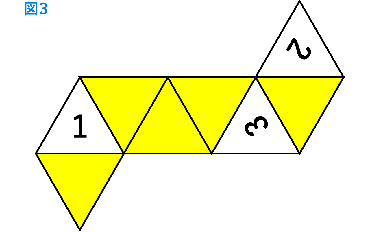 (4)この立体の展開図で、1,2,3の書かれている三角形の配置が図3のようになるとき、