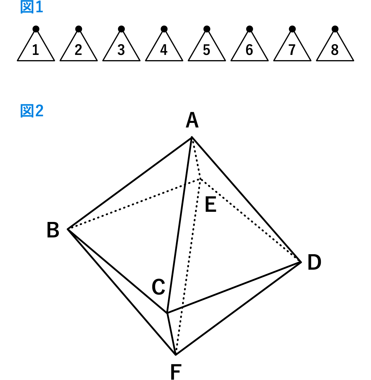 ただし、図1の正三角形の黒丸の頂点は立体の点Aまたは点Fのどちらかに重ね、